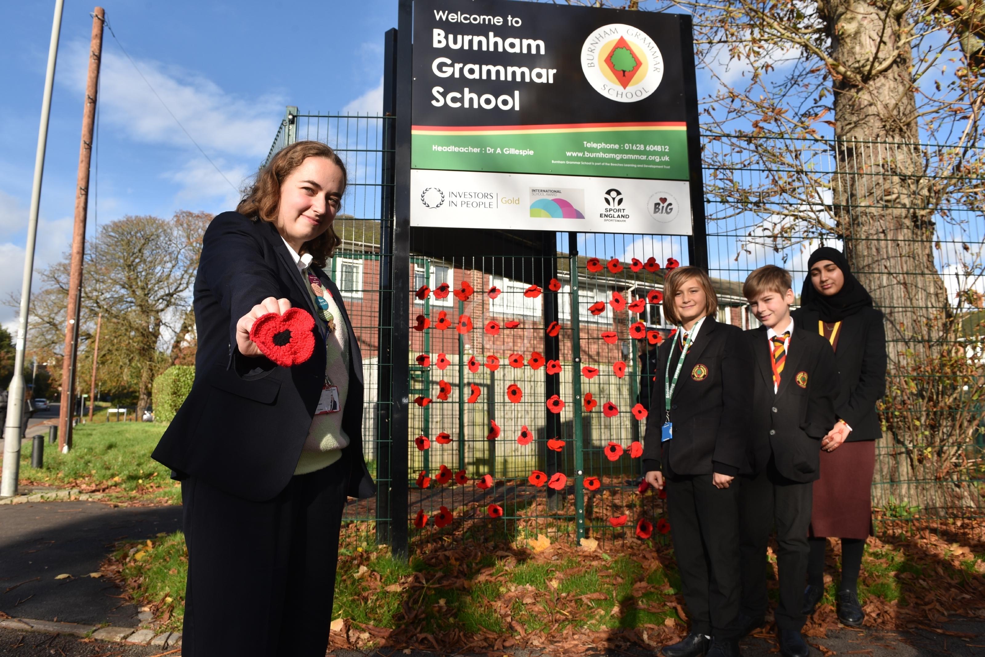 Burnham Grammar School Crochet Club – poppiesThe school runs a crochet club for students and their current project has been making crocheted poppies for Remembrance Day. Eva Baker 16, L-R John Weeks 11, Tobi Dunk 11Aaminah Zia 16
