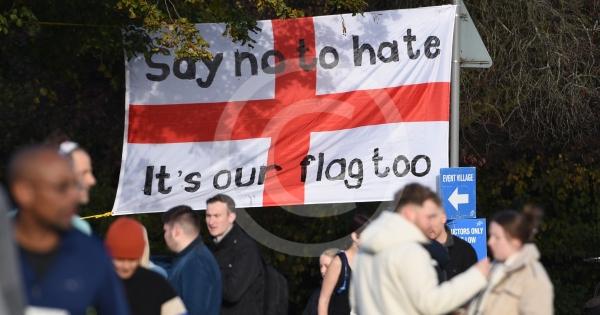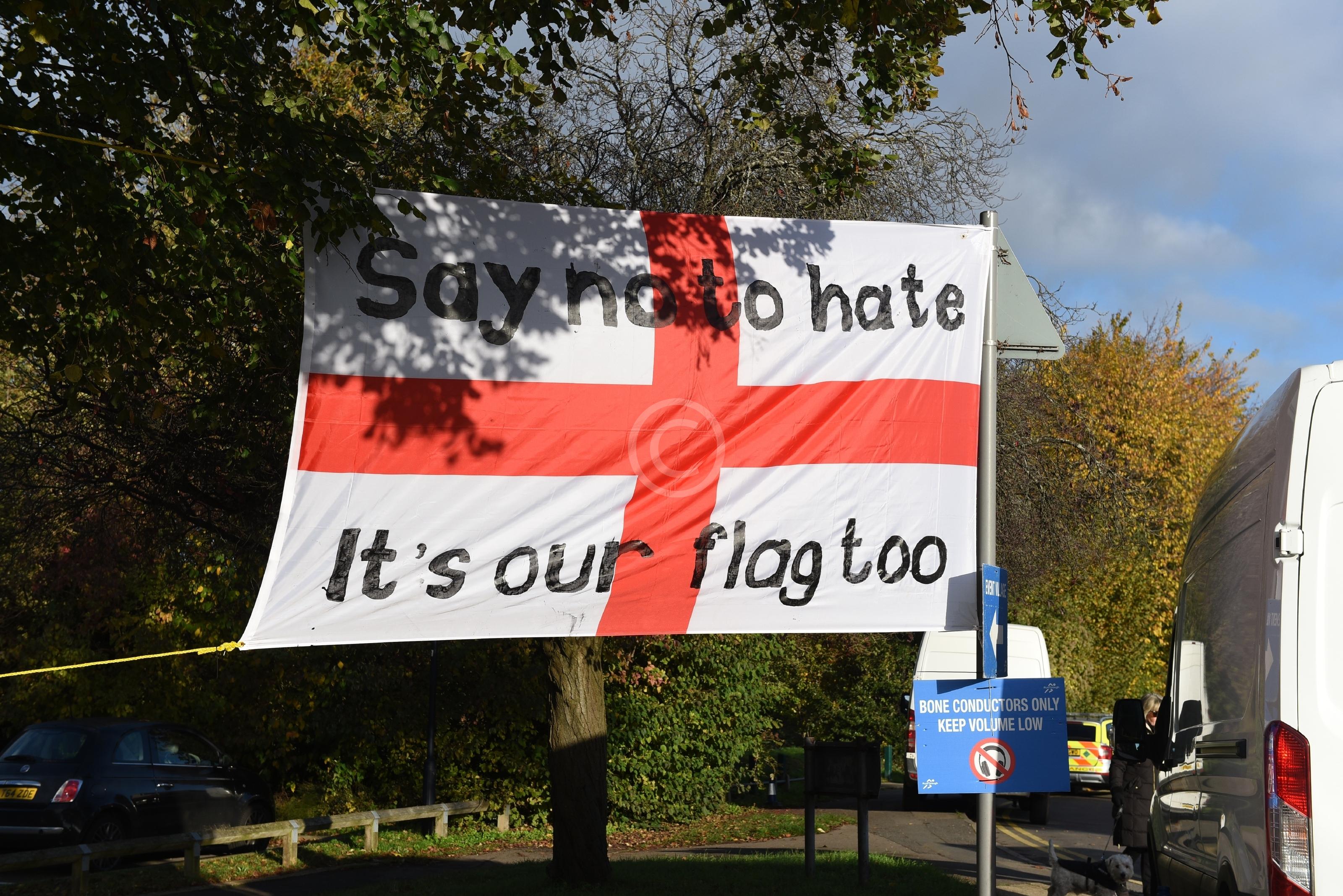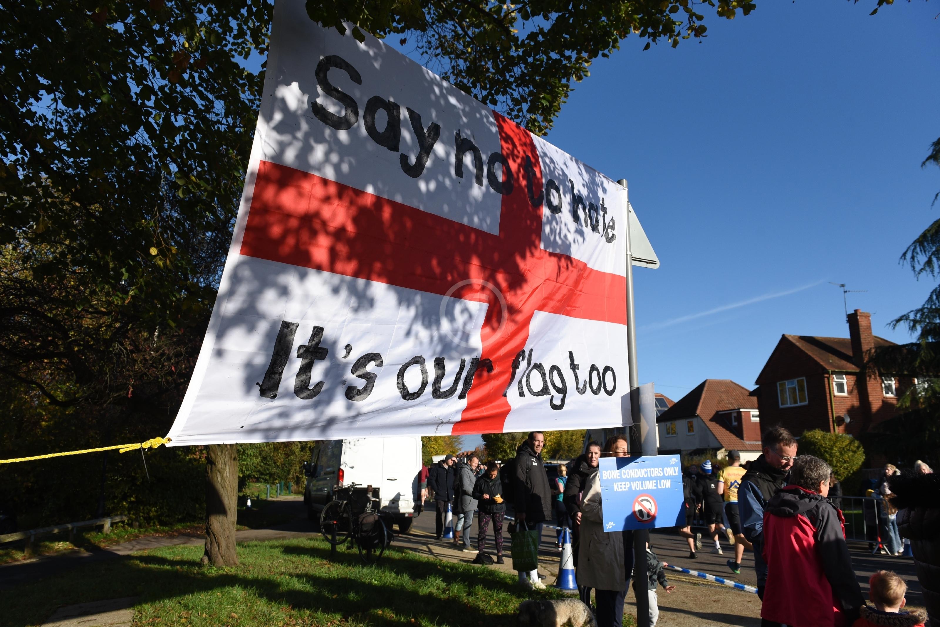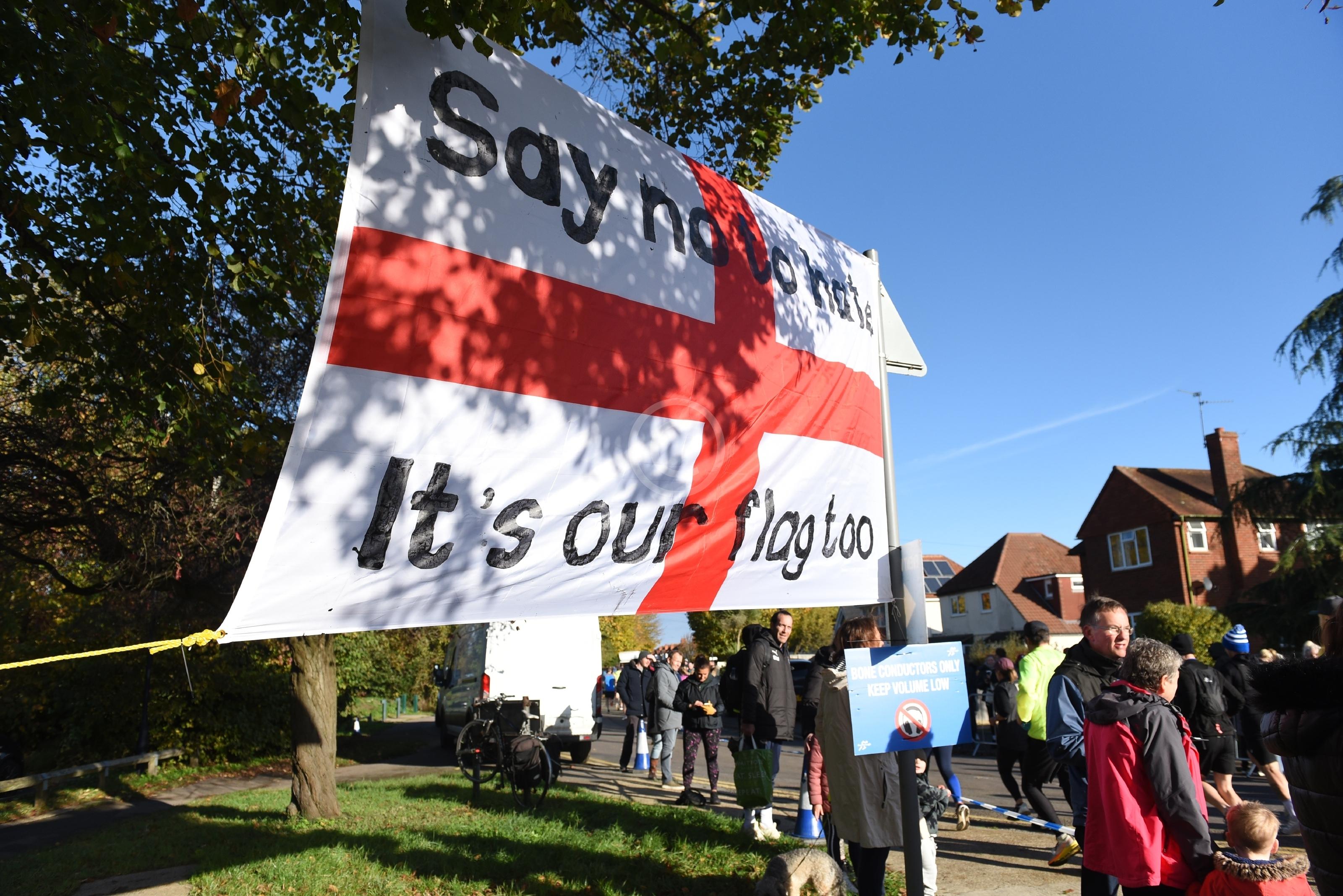 Flag at Half Marathon Start, MaidenheadSay No To Hate, it's our Flag Too(Berkshire Agaisnt Hate)