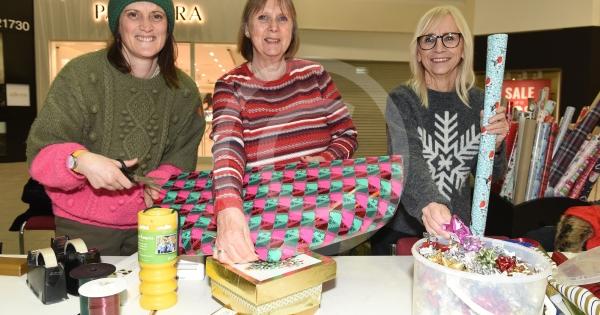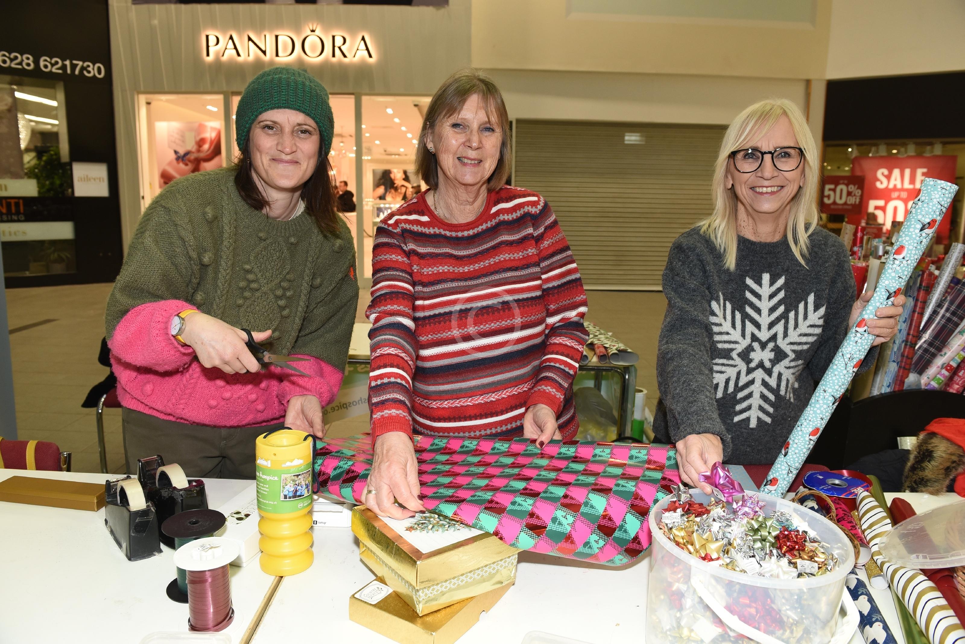 Thames Hospice fundraising group are carrying out Christmas wrapping in the Nicholsons Centre, Maidenhead L-R Susie Randall, Jenny Harris, Sue Stacey