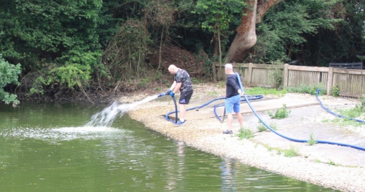 Parish clerk Andrew Donachie and Councillor Stuart Howe were assisted by employees of the property developer to pump water into the pond from a washout hydrant in Widmore Lane. Mr Donachie said that the water level will be measured after the initial water delivery and monitored each day thereafter.